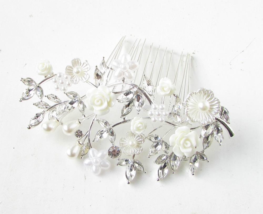Featuring ivory rose flowers and daisies and silver diamantes.