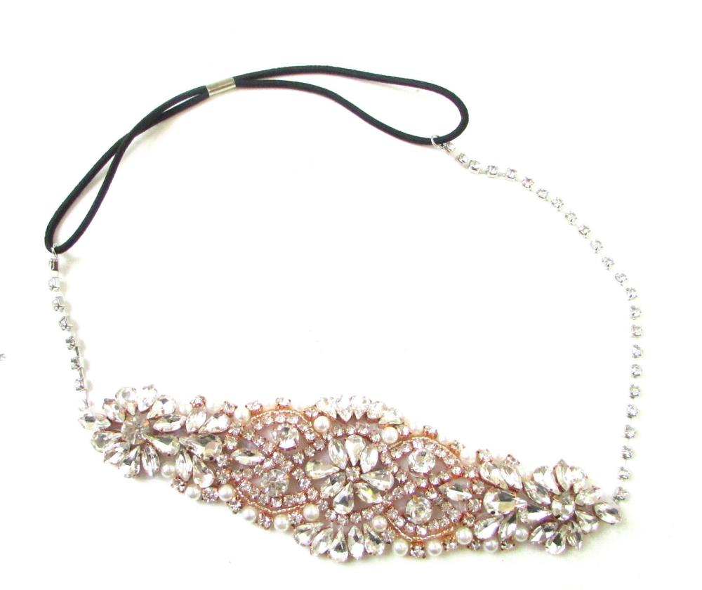 Beautiful vintage style rhinestone/diamante headband! This headpiece is stunning! Featuring silver tone diamantes/rhinestones and faux pearl beading in rose gold tone surround on a silver tone alloy rhinestone base. Measures 5cm at it's widest. The headband base measures 0.3cm wide and is elasticated at the back to fit.